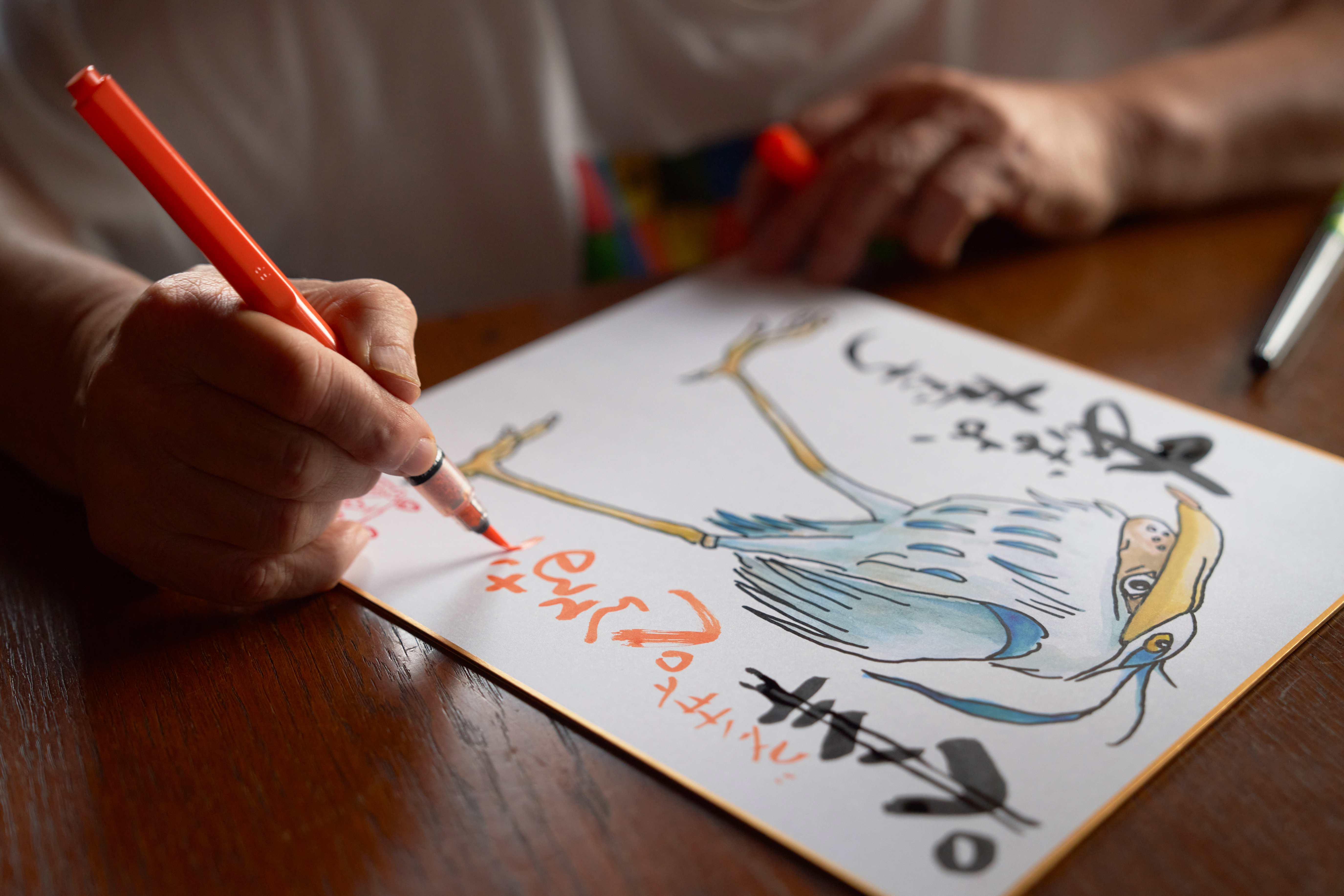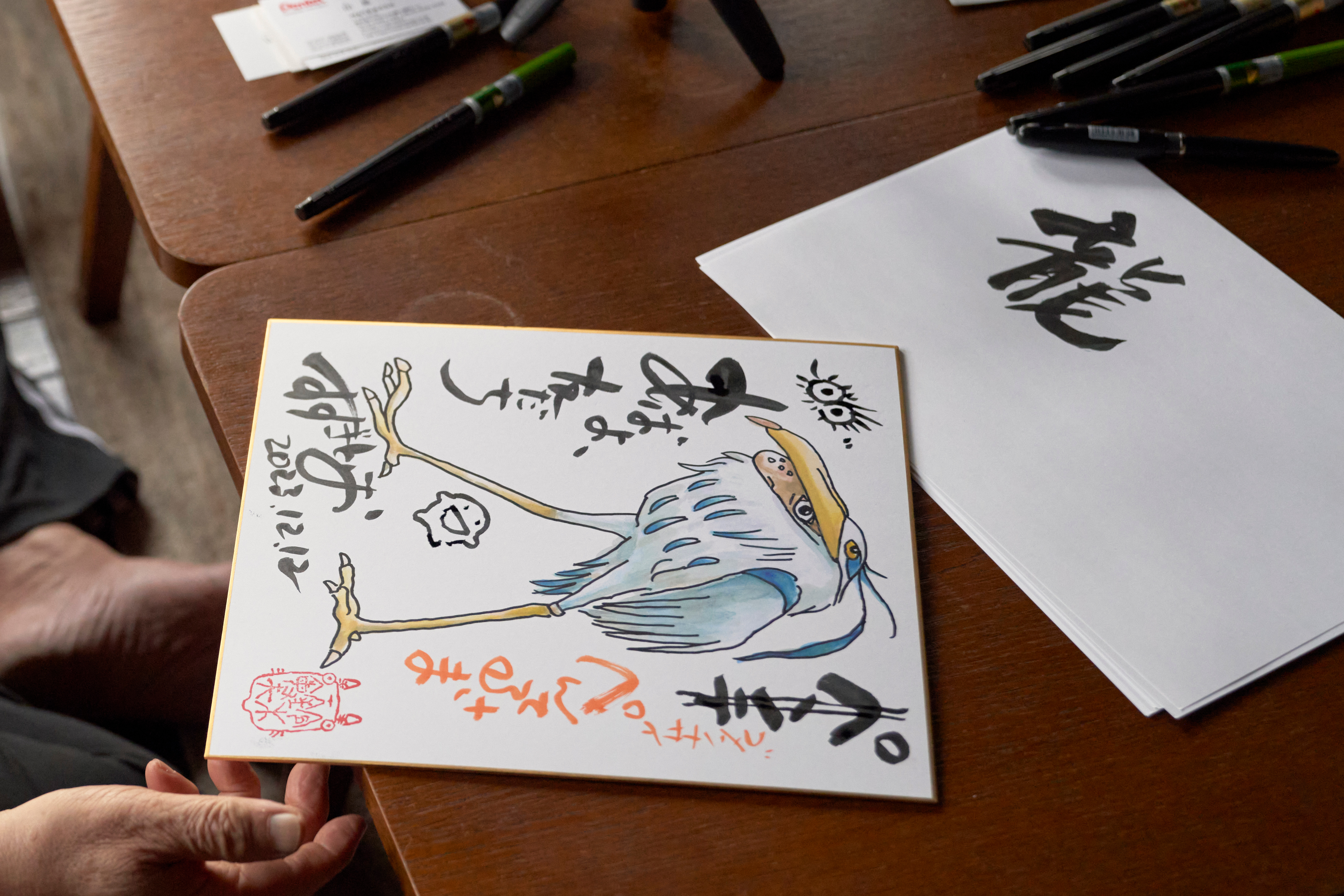 私たちもぜひにとお願いしたところ、取り出したのは、宮﨑監督の最新作『君たちはどう生きるか』の重要キャラクターである青サギが描かれた色紙。