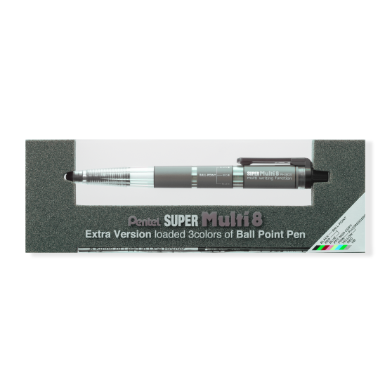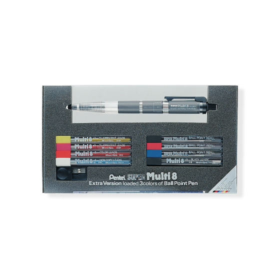 1本に8種類の芯を内蔵したホルダータイプのシャープペンシル。ボールペン芯3色、蛍光芯2色内蔵の本格派多機能筆記具。